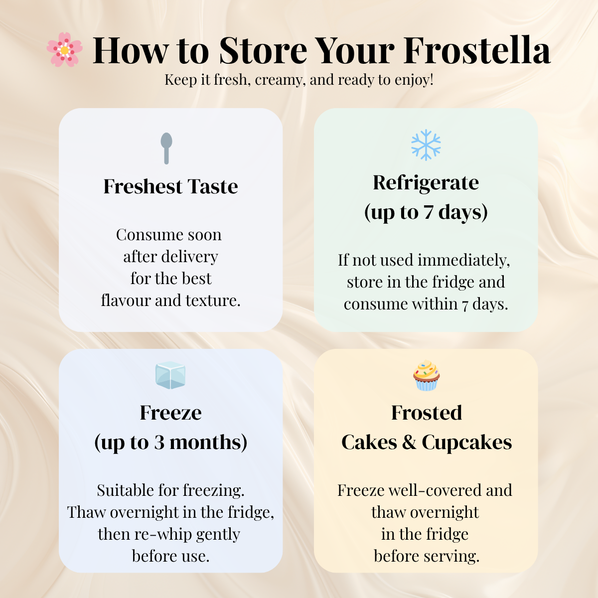 Frostella is suitable for freezing for up to 3 months. When ready to use, thaw overnight in the fridge, then gently stir or re-whip for a smooth, creamy texture.